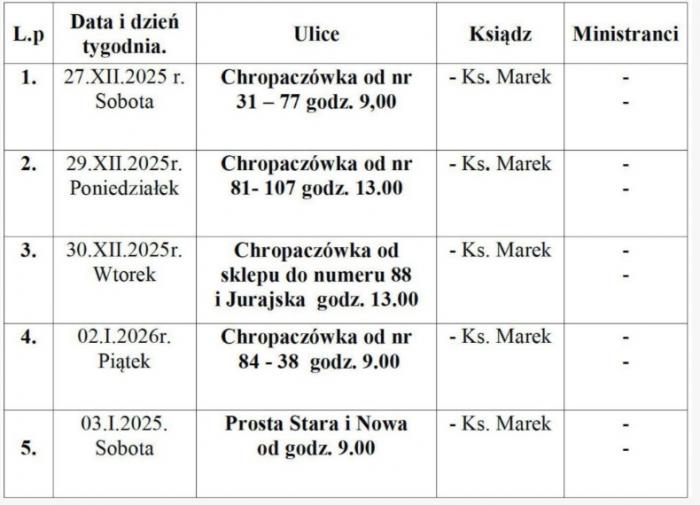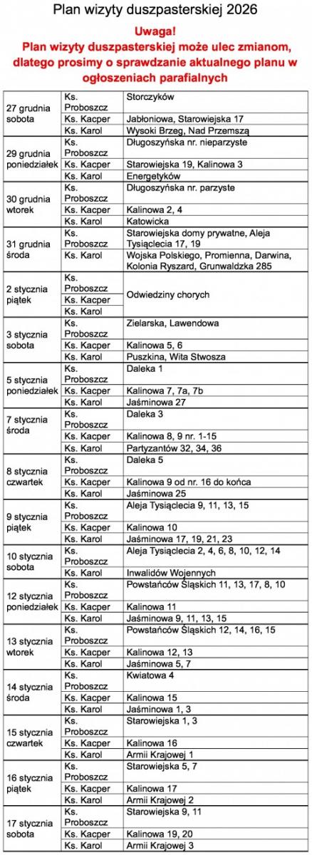 Harmonogram kolędy będzie podawany z tygodnia na tydzień. Najbliższy zostanie podany w niedzielę, 28 grudnia.