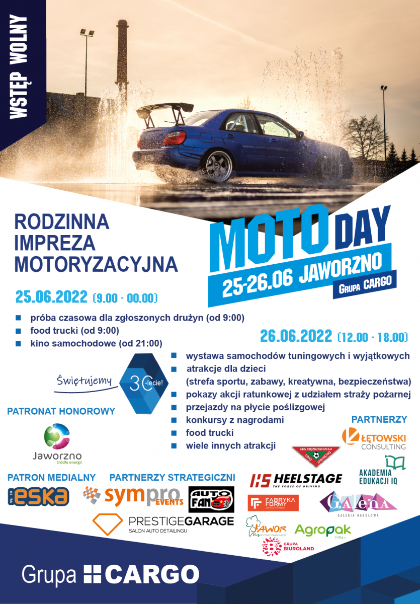 Już po raz kolejny Grupa Cargo z Jaworzna zaprasza do bezpłatnego udziału w święcie motoryzacji, na terenie swojego ośrodka szkoleniowego. W tym roku MOTO DAY zbiega się z 30-tymi urodzinami firmy i dlatego potrwa, aż dwa dni (25-26 czerwca).  Wśród atrakcji dla dorosłych, dzieci i młodzieży znajdą się pokazy bezpieczeństwa z udziałem straży pożarnej i tajniki ratownictwa medycznego, przejazdy na płycie poślizgowej, możliwość użycia symulatorów (w tym symulatorów dachowania), kino samochodowe, food trucki. Nie zabraknie samochodów tuningowych i wyjątkowych, strefy sportu, zabaw, strefy kreatywnej. Każdy znajdzie tu coś dla siebie.