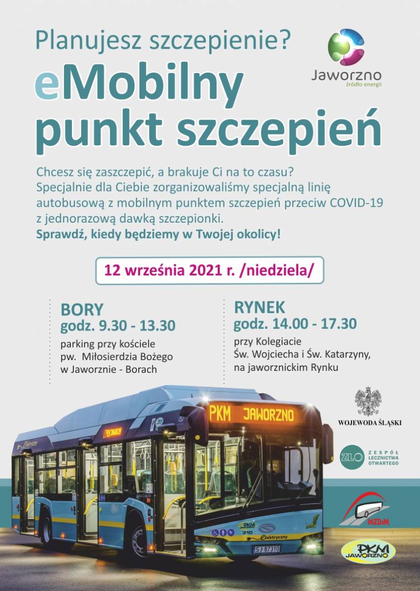 Mobilny punkt szczepień w postaci miejskiego autobusu pojawi się w Borach przy kościele pw. Miłosierdzia Bożego w godzinach od 9:30 do 13:30 oraz przy kolegiacie św. Wojciecha i św. Katarzyny w centrum Jaworzna w godz. od 14:00 do 17:30.
