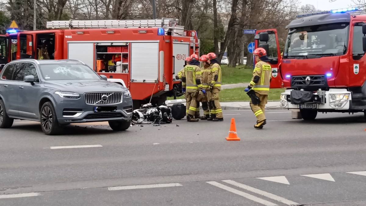 Kolizja motocykla z samochodem osobowym przy ul. Grunwaldzkiej w Jaworznie.