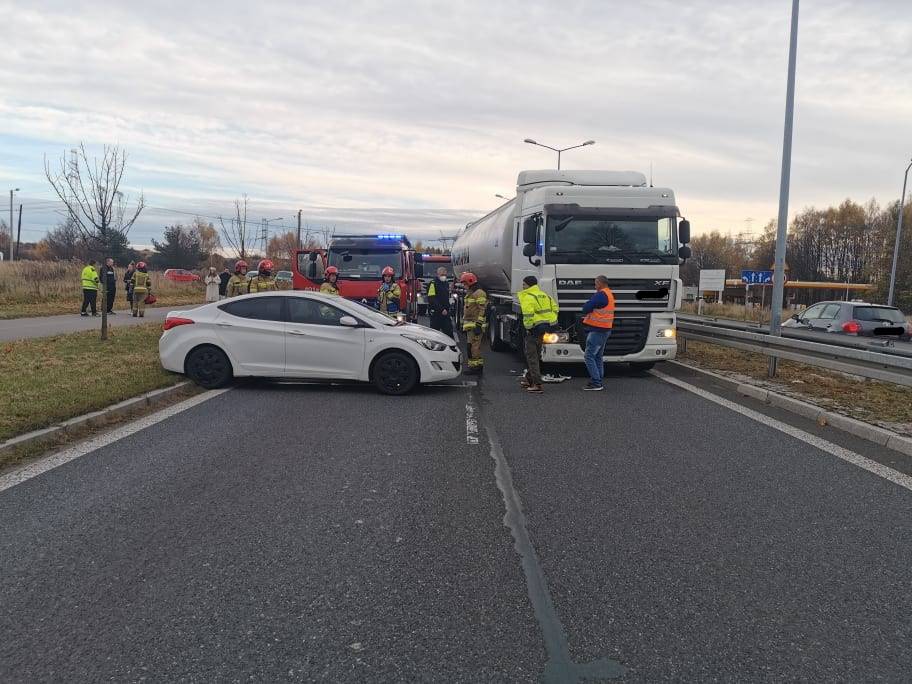Kolizja na ulicy Krakowskiej w Jaworznie. Samochód osobowy zderzył się z ciężarówką.