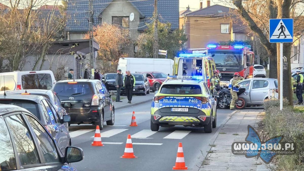 Na ulicy Wygoda w Jeleniu doszło do kolizji samochodu osobowego z motocyklem. Na miejscu interweniują wszystkie służby – policja, straż pożarna i pogotowie, które udziela pomocy poszkodowanemu motocykliście.