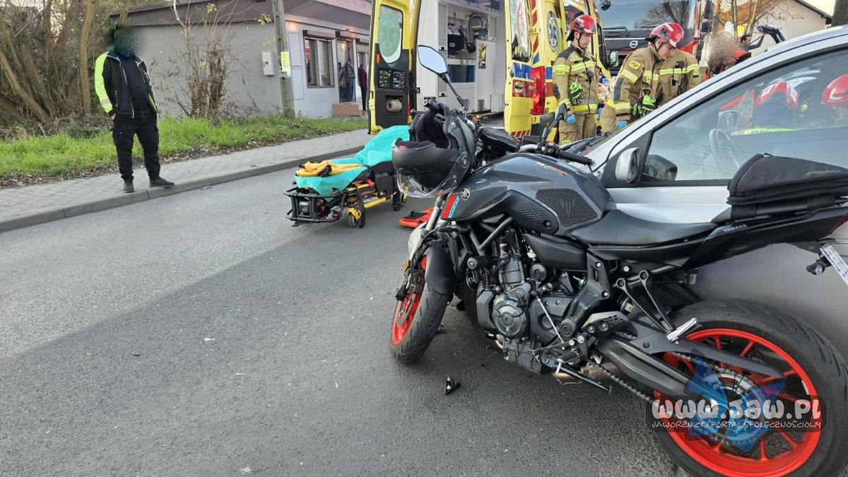 Ze wstępnych ustaleń policjantów wynika, że kierująca Toyotą Yaris kobieta wyjechała na główną ulicę, nie zachowując należytej ostrożności i doprowadziła do zderzenia z motocyklem. Ratownicy, którzy przybyli na miejsce udzielają pomocy poszkodowanemu mężczyźnie.