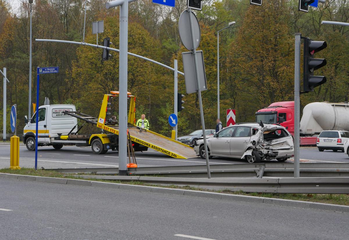Samochód uderzył w jeden, a następnie drugi samochód ciężarowy. Uczestnicy kolizji byli trzeźwi. Sprawcę zdarzenia ukarano mandatem w wysokości 100 zł.
