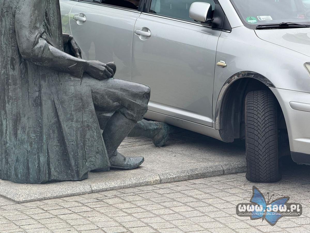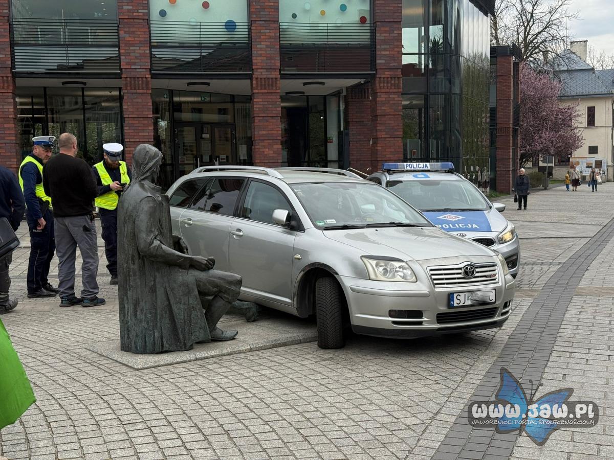 Kierujący samochodem marki Toyota poruszał się po placu. Podczas próby wykonania skrętu najechał na wyprostowaną nogę pomnika drwala. Jak widać, nawet nieruchomi uczestnicy ruchu potrafią zaskoczyć.