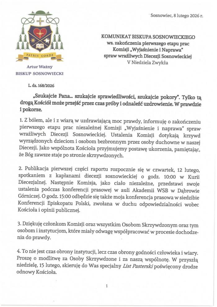 Komisja „Wyjaśnienie i naprawa” zakończyła pierwszy etap prac dotyczących spraw wrażliwych w diecezji sosnowieckiej. Pierwsza część raportu zostanie upubliczniona w czwartek, 12 lutego 2026 roku — poinformował biskup sosnowiecki Artur Ważny w specjalnym komunikacie, który miał być odczytany dzisiaj we wszsytkich kościołach parafialnych oraz kaplicach diecezji sosnowieckiej.