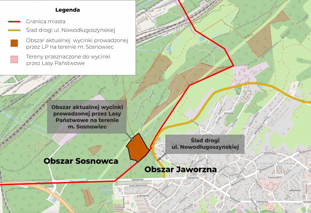Według informacji zamieszczonej w Banku Danych o Lasach dotyczących Nadleśnictwa Chrzanów dla pododdziału 351 g, przewidziano wycinkę drzew w ramach rębni zupełnej. Dane te dotyczą lasu zlokalizowanego na terenie Sosnowca na gruntach w zarządzie Lasów Państwowych, a nie jak przekazywana jest informacja, na terenie Miasta Jaworzna. Zamieszczona mapa obrazuje wszystkie pododdziały leśne z Banku Danych o Lasach, w których zaplanowano rębnie w bieżących Planach Urządzenia Lasu. Mapa nie pokazuje planowanych trzebieży.