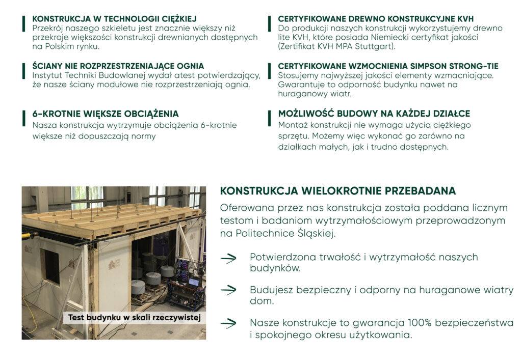 - sprawdzoną technologię szkieletową (przeprowadzone na Politechnice Śląskiej badania i testy wykazały, że budynek wytrzymuje 6- krotnie większe obciążenia niż dopuszczają obowiązujące normy krajowe i europejskie. System posiada certyfikat NRO).