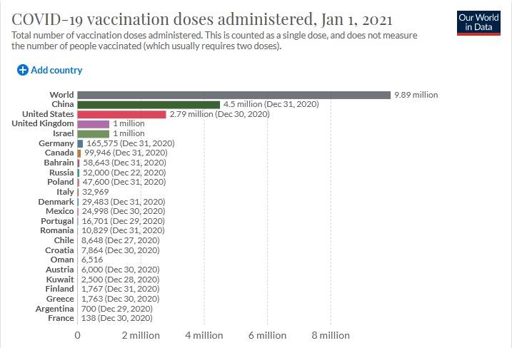 Na świecie z kolei przeprowadzono już prawie 10 milionów szczepień (stan na 1 stycznia 2021, źródło: ourworldindata)