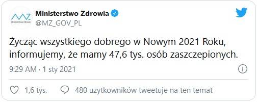 Szczepienia na COVID-19 rozpoczęły się w Polsce zaledwie kilka dni temu - 27 grudnia. Jak podało w Nowy Rok Ministerstwo Zdrowia, od tego czasu zaszczepionych zostało już 47,6 tys. osób.