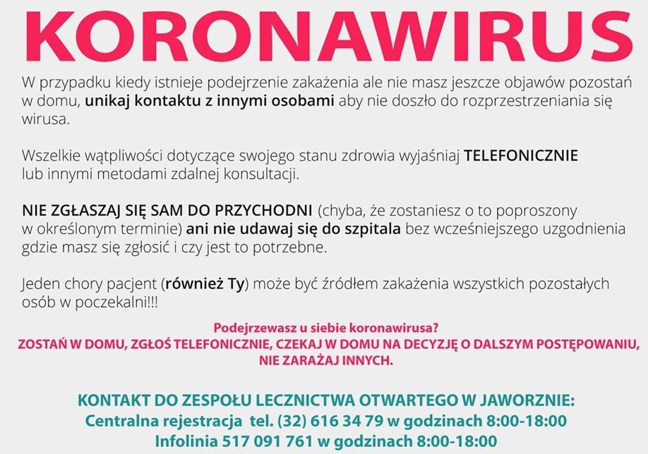 W ramach prowadzonych działań mających na celu ograniczenie rozprzestrzeniania się koronawirusa, Zespół Lecznictwa Otwartego Sp. z o.o. prosi Pacjentów o wybieranie formy kontaktu telefonicznego placówkami medycznymi poprzez Centralną Rejestracją Zespołu Lecznictwa Otwartego Sp z o.o. Jaworznie. Centralna Rejestracja - 32 616 34 79