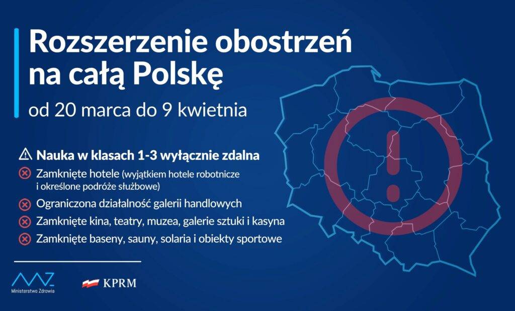 Jak poinformował na konferencji 17 marca minister zdrowia Adam Niedzielski, w całym kraju zamknięte zostaną teatry, kina, baseny, obiekty sportowe, ograniczona będzie działalność galerii handlowych itd. Nauczanie dla klas I-III prowadzone jest w systemie zdalnym.