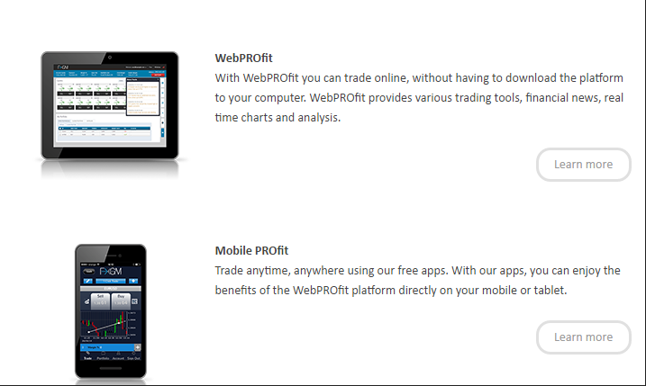 FXGM wyróżnia się dzięki prostej w obsłudze, a zarazem zaawansowanej platformie. Inwestorzy mogą liczyć na szereg przydatnych rozwiązań, a jednocześnie nie muszą uczyć się obsługi skomplikowanego systemu. Osoby, które korzystają z komputerów stacjonarnych powinny zapoznać się z wersją WebPROfit.
