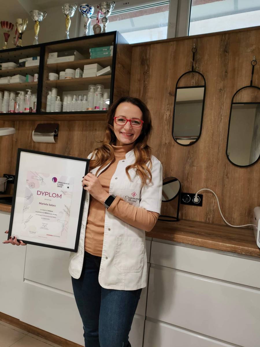 [caption id="attachment_272056" align="aligncenter" width="1152"] Mariola Solarz w swoim salonie Diamentowy Blask z dyplomem Konkursu Mistrzowie Urody 2022[/caption]