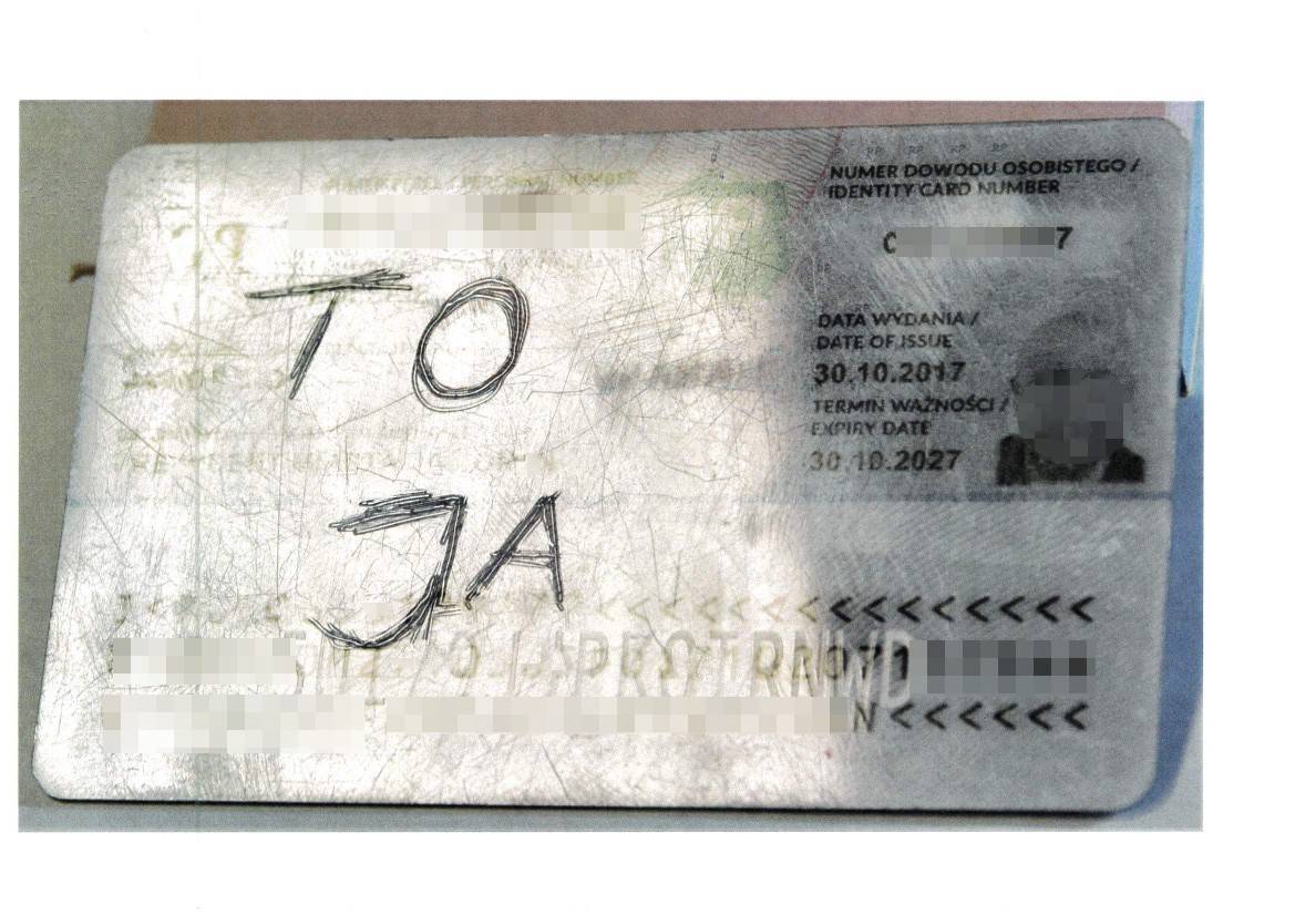 Mężczyzna wylegitymował się jednak zwracającym uwagę dowodem osobistym. Zarówno na awersie, jak i rewersie dokumentu znalazły się wydrapane ostrym narzędziem napisy i obsceniczne rysunki.