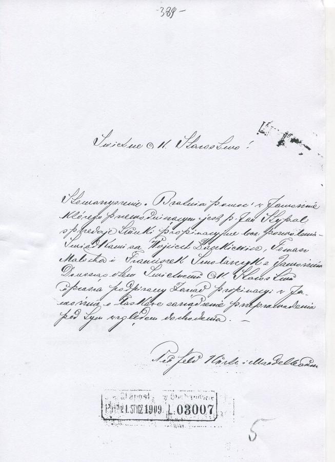 21 stycznia 1909 do „Świetnego” c. k. starostwa w Chrzanowie wpłynęło całkiem profesjonalnie sporządzone pismo informujące, że jaworznicka Bratnia Pomoc „sprzedaje trunki propinacyjne bez pozwolenia.” (przyp. 13) Wiemy, kto doniósł na Bratnią Pomoc i na Stypala: niejaki Mandelbaum, który sam świadkiem owego „handlu” nie był. Na świadków podał Wojciecha Daczkiewicza, Tomasza Małochę i Franciszka Smolarczyka.