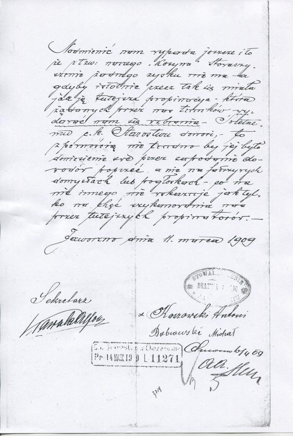 Jan Stypal, ówczesny przewodniczący Bratniej Pomocy, musiał się w starostwie tłumaczyć. 11 marca 1909 Koszowski Antoni i Bobrowski Michał wystosowali do starostwa obszerne wyjaśnienie, że trunki podaje się tylko podczas zabaw, a zakupywane są wyłącznie ze składek uczestników zabawy. Nie jest to handel i koncesji na taką działalność nie trzeba.