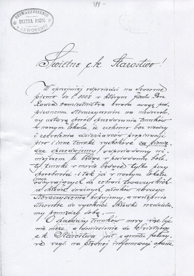 „O sprzedaży trunków mowy więc być nie może, a doniesienie do Świetnego c.k. Starostwa jest z gruntu fałszywe. Nadmienić nam wypada jeszcze, i to że z tzw. naszego <> Stowarzyszenie żadnego zysku nie ma […]. ” (przyp.14)
