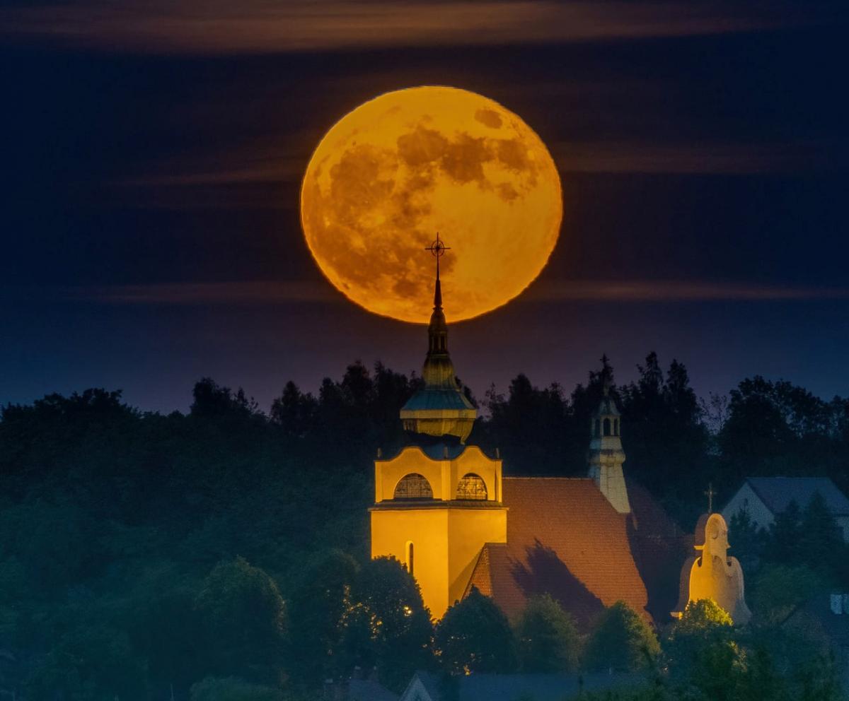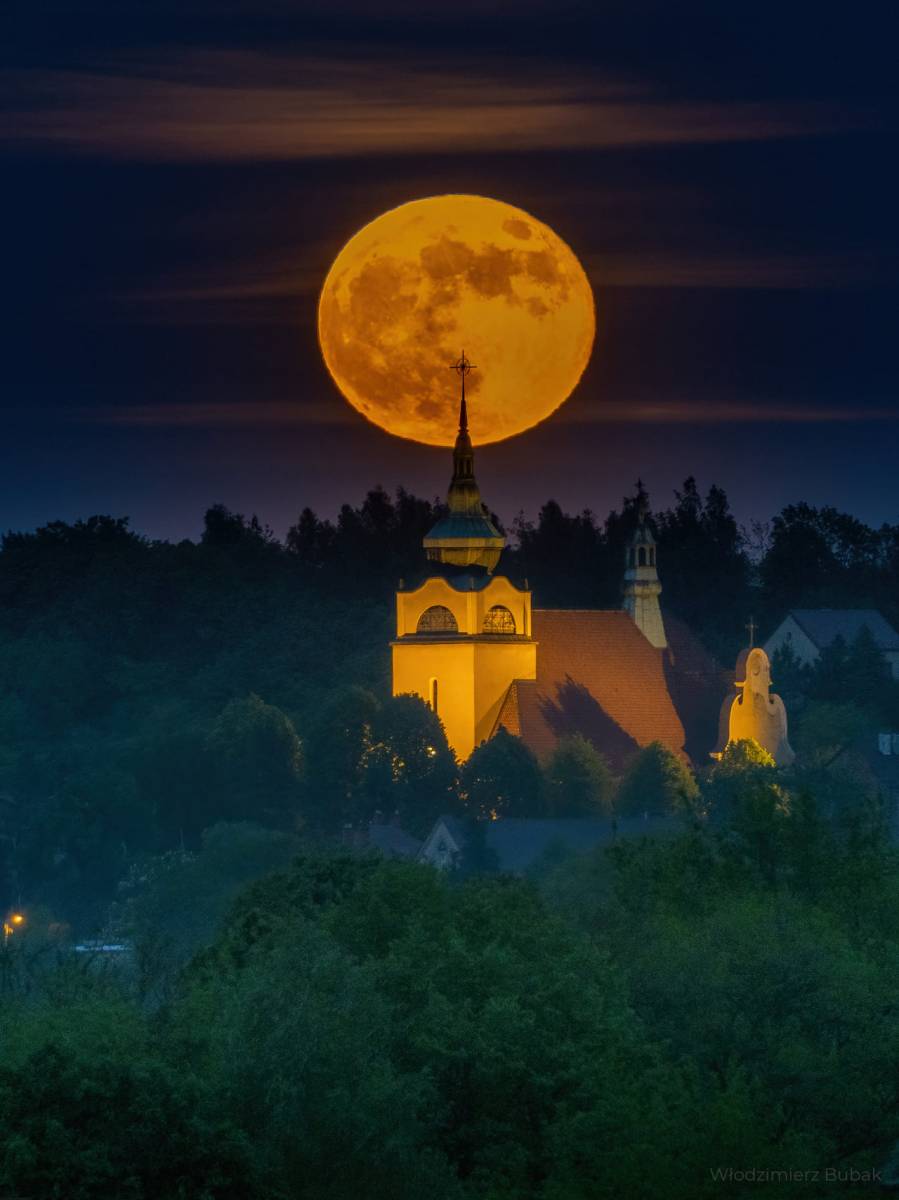 Niezwykle klimatyczne ujęcie przedstawia Księżyc w pełni, a na pierwszym planie kościół pod wezwaniem Matki Bożej Nieustającej Pomocy w Ciężkowicach przy ul. Andrzeja Mroczka wraz okolicznymi zabudowaniami.