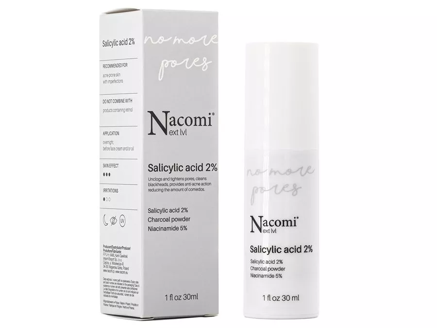 Nacomi - Next Level - Salicylic Acid 2% - Złuszczające Serum z 2% Kwasem Salicylowym popularnej polskiej marki wzbogacone węglem aktywnym i niacynamidem.