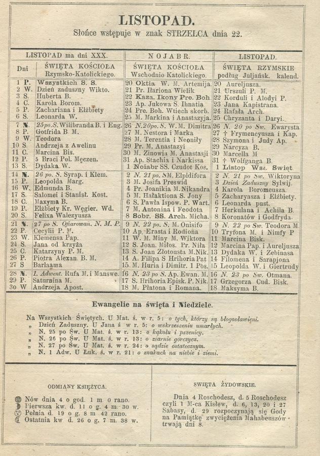 Daty dzienne były różne. Kiedy sięgnęłam do kalendarza z 1869 roku, to pod datą 17 listopada znalazłam informacje: Salomei i Stanisława Kostki.