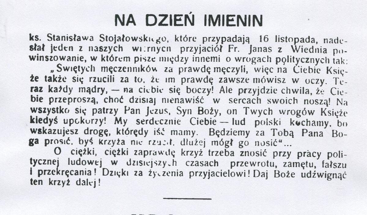 Helena Hampel w książce „Wspomina z życia ks. Stanisława Stojałowskiego” cytuje list, który z Cieszyna przysłał do niej Stojałowski w roku 1891, pisał w dzień po swoich imieninach: „Bawią mię ci, co są w kłopocie, czego mi mają życzyć. Wszak tylko ten, co życia nie rozumie, bywa w takiej wątpliwości”. Szczere życzenia budziły w nim podziw dla chłopskiej inteligencji: „Niech Pan Jezus da zdrowie i co wola Jego - i wytrwałości we wszystkim!” - pisali do niego włościanie. A Franciszek Janas z Wiednia przysyłając życzenia nawiązuje do politycznych przeciwników księdza: