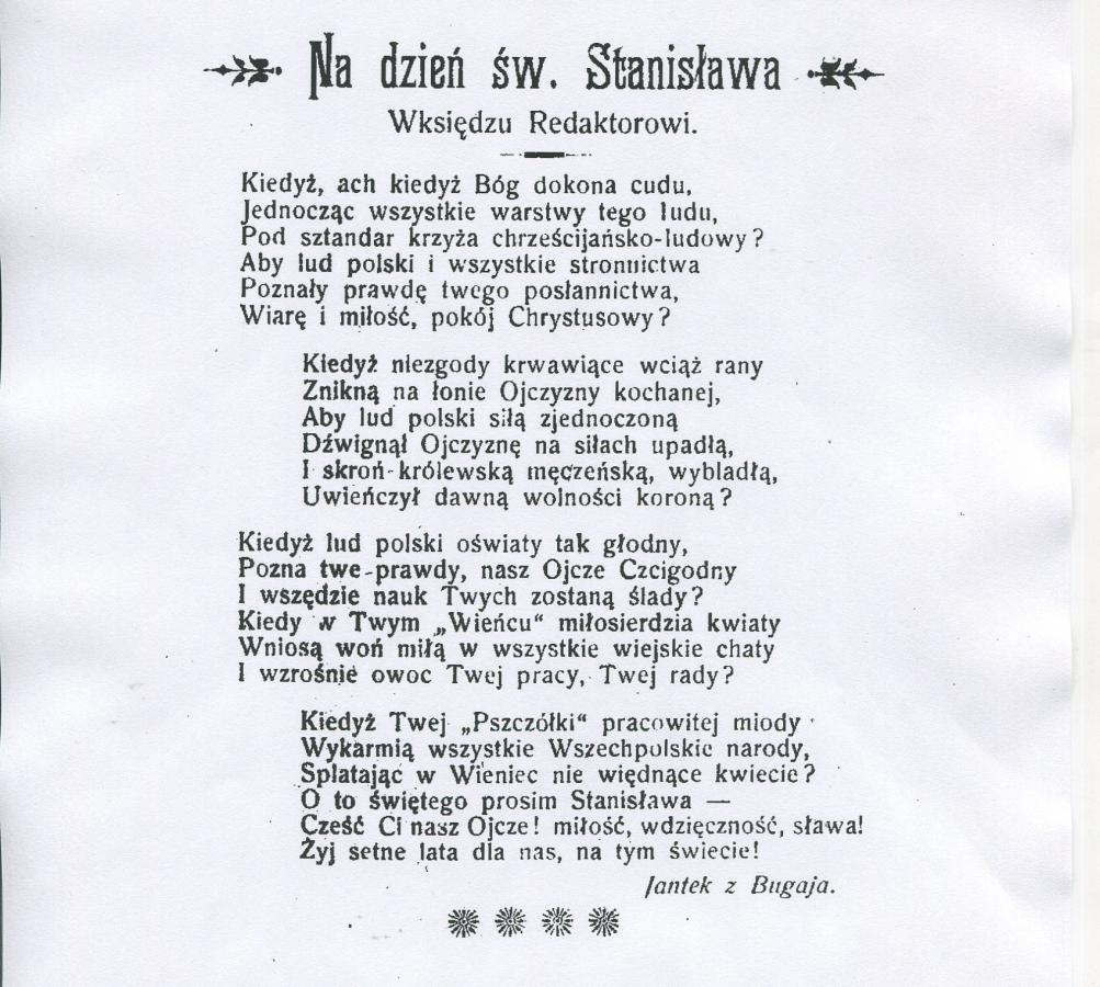 Tygodnik „Wieniec-Pszczółka” każdego roku w listopadowych numerach drukował życzenia dla księdza Redaktora, wiersze mu poświęcone, informował o uroczystych spotkaniach imieninowych organizowanych w kraju przez wiernych mu włościan i robotników. Licznie napływały do redakcji wierszowane życzenia z kraju i z zagranicy. Od Polonii w Ameryce przysłano taki: