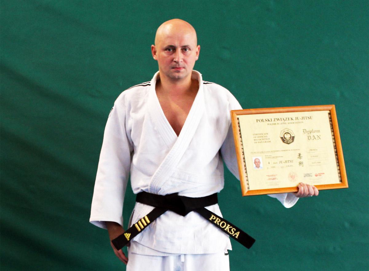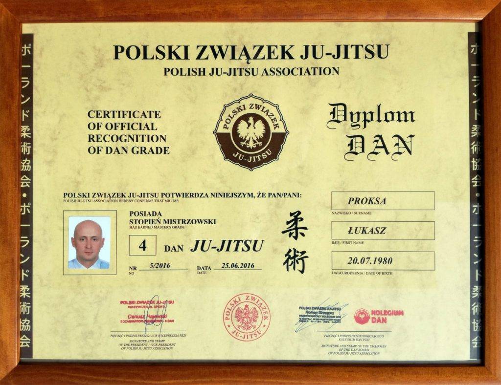 Egzamin na stopień 4 dan jest przedostatnim jaki można zdobyć na drodze egzaminu i składa się z kilku części. Pierwsza to pokaz układu Nage-No-Kata czyli technik rzutów podzielonych na pięć grup w tym: ręczne, nożne, biodrowe oraz poświęcenia z upadkiem na plecy i z upadkiem na bok. Druga części egzaminu to prezentacja Kaeshi (kombinacji) i Renroku (kontrataków) z wszystkich technik ze stopni 7-1 kyu, w tym technik dźwigni, duszeń i trzymań w parterze uzupełnionych o techniki Atemi (uderzenia) takie jak ciosy, kopnięcia i bloki. W części trzeciej prezentuje się techniki obron oraz interwencji wykorzystywane w samoobronie. W ostatniej czwartej część egzaminowany toczy Randori, czyli walki treningowe z kilkoma przeciwnikami. Zarówno poziom zaprezentowanych technik jak i postawa na macie została wysoko oceniona przez komisje i egzamin został jednogłośnie zaliczony a mistrz Łukasz Proksa uzyskał stopień 4 dan w Ju-jitsu potwierdzony certyfikatem Polskiego Związku Ju-jitsu, honorowanym przez organizacje sportowe na całym świecie.Jeśli jeszcze tego nie zrobiłeś koniecznie zainstaluj naszą aplikację, która dostępna jest na telefony z systemem Android i iOS.