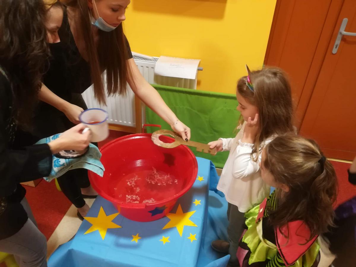 W tym dniu na dzieci czekało wiele niespodzianek. Na początku przedszkolaków odwiedziły dwie czarownice, w których postaci wcieliły się nasze nauczycielki. Czarownice, nie tylko przyleciały, ale również wprowadziły dzieciaczki w świat wróżb i magii. Dzieci dowiedziały się wiele ciekawostek na temat zwyczajów obchodzenia Andrzejek. Razem z czarownicami, dzieci odbyły wycieczkę po wszystkich przystrojonych magiczną dekoracją salach przedszkola. W każdej sali czekały na nie ukryte wróżby oraz wesołe zabawy. Na końcu magicznej podróży czekała je, najbardziej znana andrzejkowa wróżba – lanie wosku.