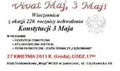 W przeddzień 220. rocznicy uchwalenia Konstytucji 3 Maja klub środowiskowy „Wega” MCKiS w Jaworznie-Ciężkowicach serdecznie zaprasza na wieczornicę p.t.: „Wiwat Maj, 3 Maj”. Odbędzie się ona już dzisiaj 27 kwietnia o godz. 17.00.