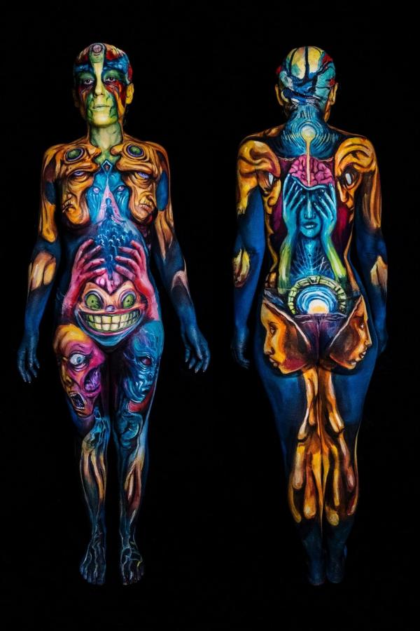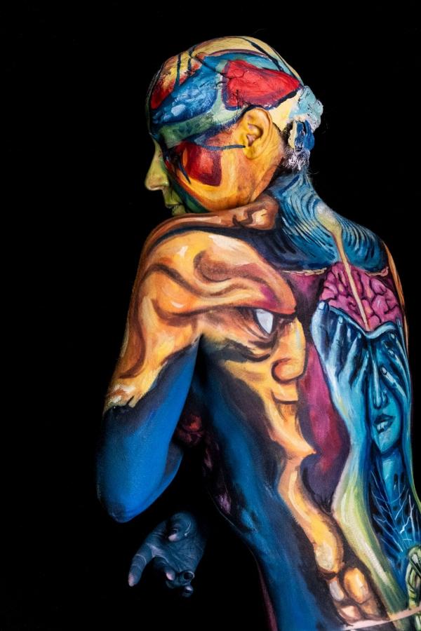 Moją modelką była Anna Litrownik z Ukrainy. Tematem mistrzostw w tej kategorii, w której startowałem, czyli pędzel i gąbka, była wolność kontra kontrola. No namalowałem to w takich żywych kolorach. Chciałem to przedstawić w taki troszkę sposób mroczny. No i na ciele modelki znajdują się różne twarze w różnych stadiach emocji, strachu, bólu - mówi Marian Folga.