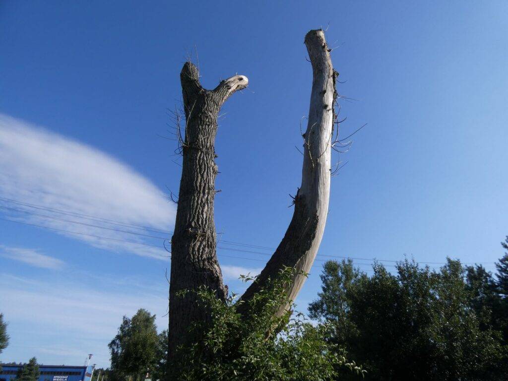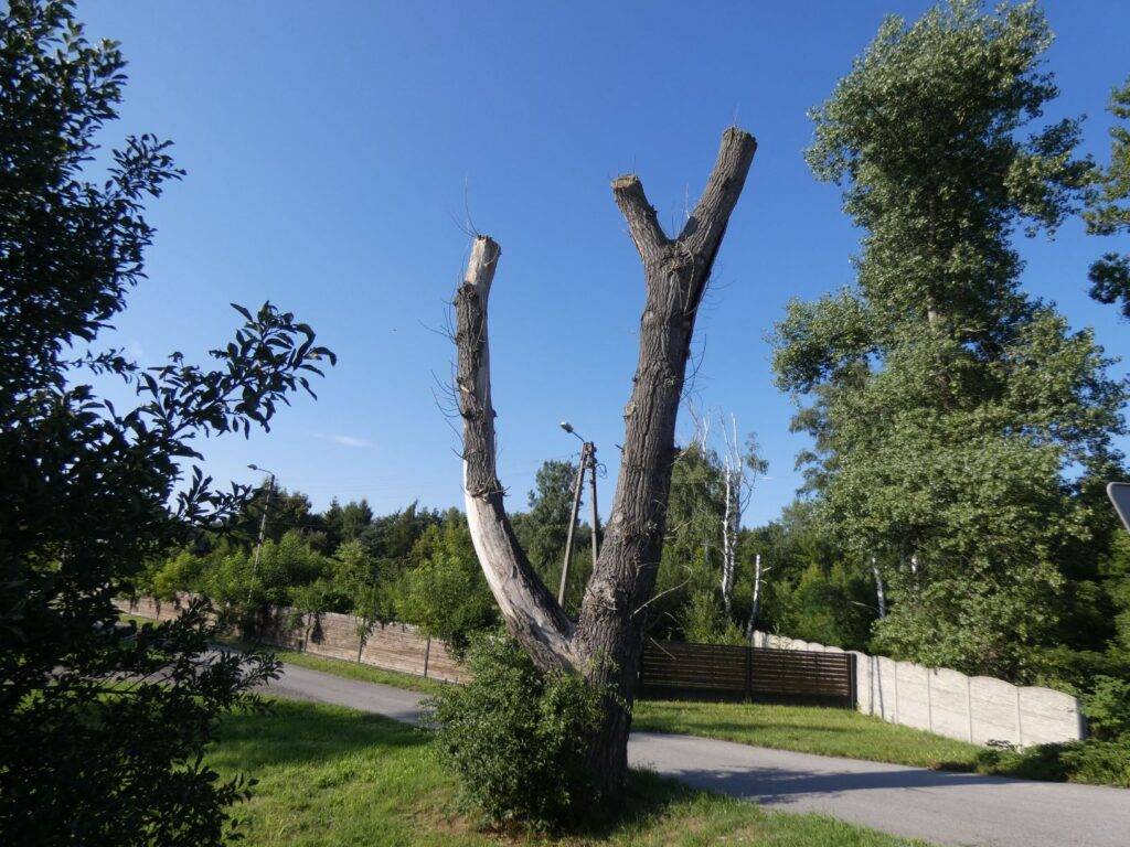 W Jaworznie - Wysokim Brzegu przy ulicy Nad Przemszą zobaczymy bardzo wysoki kikut po topoli kanadyjskiej. Jak widać, miała tutaj miejsce radykalna redukcja korony. Teraz już tak nie wolno przycinać drzew. Zanim zostało przycięte, wyglądało tak jak jego sąsiedzi.
