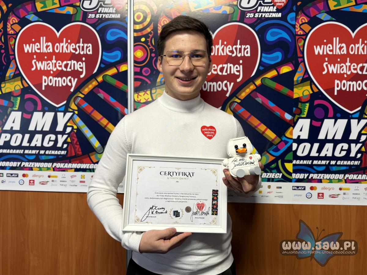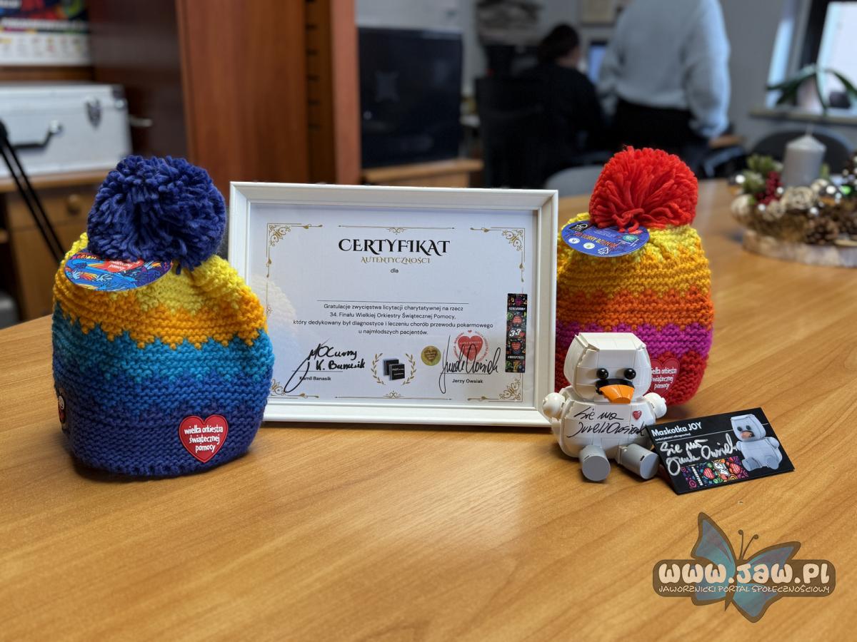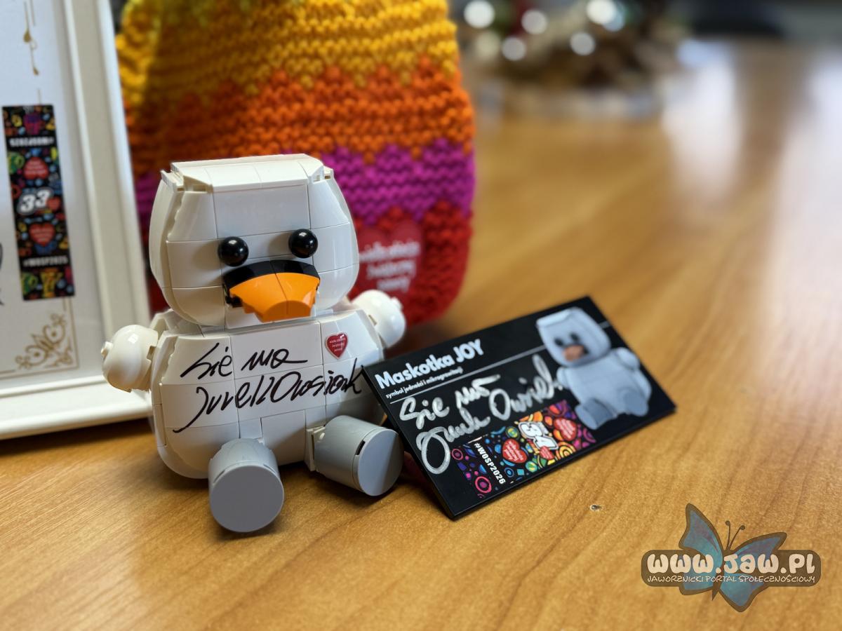 Na zwycięzcę czeka certyfikat autentyczności, na którym złożył swój podpis zarówno Jerzy Owsiak, jak i ja, autor tego projektu, oraz dwie czapki finałowe. Na maskotce również znajdują się emblematy Wielkiej Orkiestry Świątecznej Pomocy, które potwierdzają, że jest to dar przekazany fundacji. Znajdują się serduszka. Co ciekawe jest też małe serduszko, które po raz pierwszy znalazło się na klockowych modelach oraz podpisy prezesa fundacji Jerzego Owsiaka – mówi Kamil Banasik.