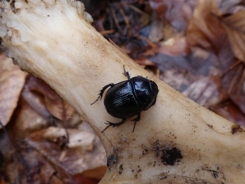 Teraz przenosimy się do doliny źródeł Jaworznika. Penetrując jej stoki natrafiliśmy również na czaszki saren. Czaszkom nie towarzyszyły resztki szkieletów, co świadczyłoby o tym, że zwierzęta nie padły w tej okolicy. Niewykluczony odpad po polowaniu, ponieważ poroża nie miały wyraźnych cech trofeum. Na jednej z czaszek pojawiły się stalowo-niebieskie chrząszcze. To żuki leśne reprezentujące rodzinę, która głównie specjalizuje się w z zjadaniu niestrawionych resztek pokarmów. Nasz bohater posiada wyraźnie podłużnie prążkowane pokrywy skrzydeł. Podobnie wygląda żuk wiosenny, ale jego pokrywy skrzydeł są gładkie. Obydwa gatunki bardzo chętnie przebywają razem w swoim towarzystwie. Masowy pojaw przypada na okres od kwietnia do października. Dzięki swoim preferencjom pokarmowym nawożą glebę, Nad Żabnikiem i Jaworznikiem zwiększając jej przewiewność. Są bardzo pożyteczne w gospodarce leśnej.