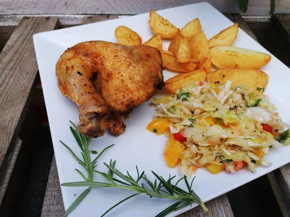 Udko z kurczaka z ziemniakami opiekanymi i surówką z białej kapusty.