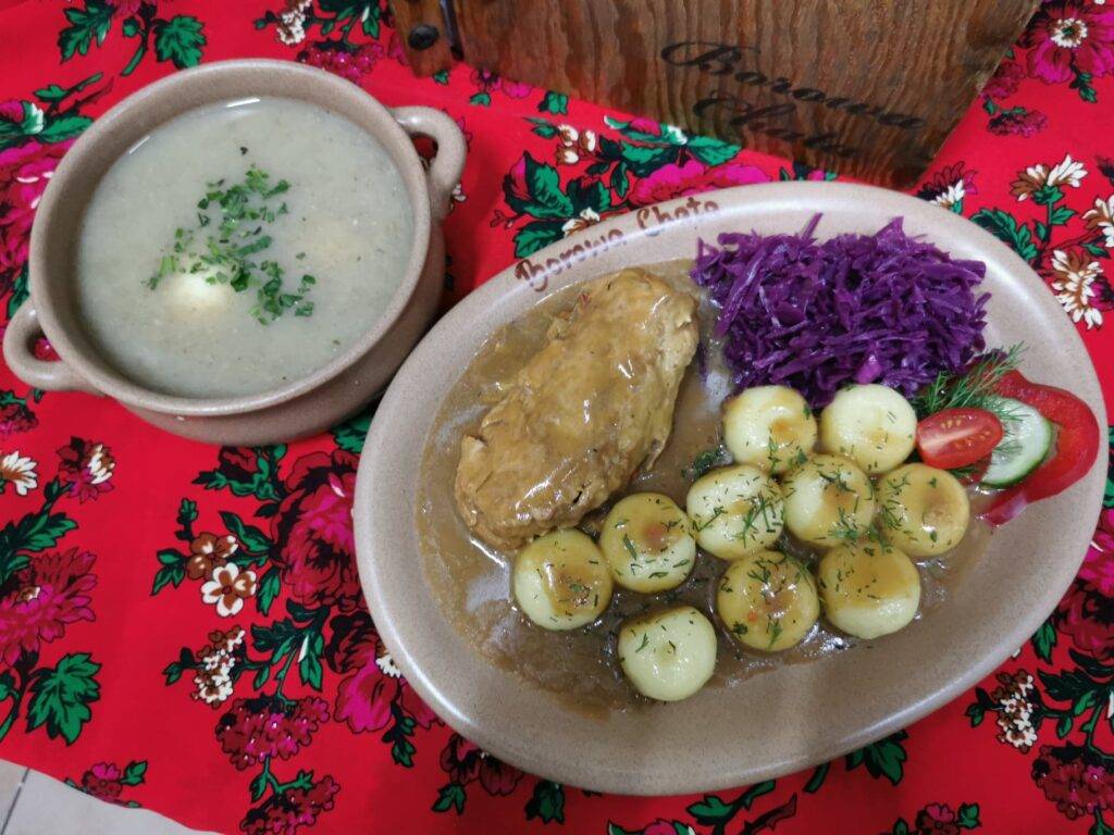Zupa pieczarkowa z makaronem albo krem pieczarkowy z groszkiem ptysiowym.