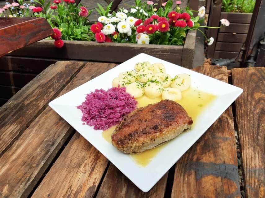 Kaczka pieczona, kluski śląskie, czerwona kapusta