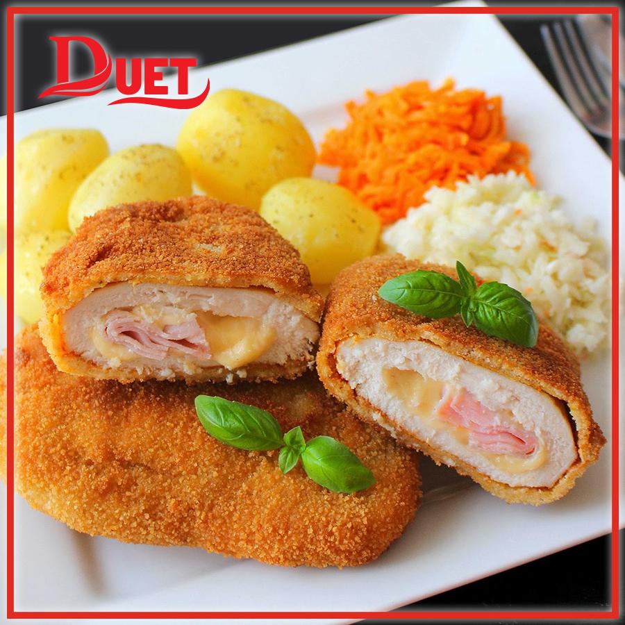 Devolay z serem i pieczarkami, ziemniaki, surówka