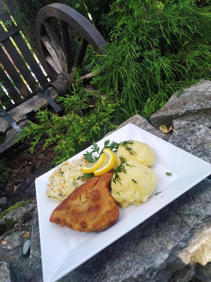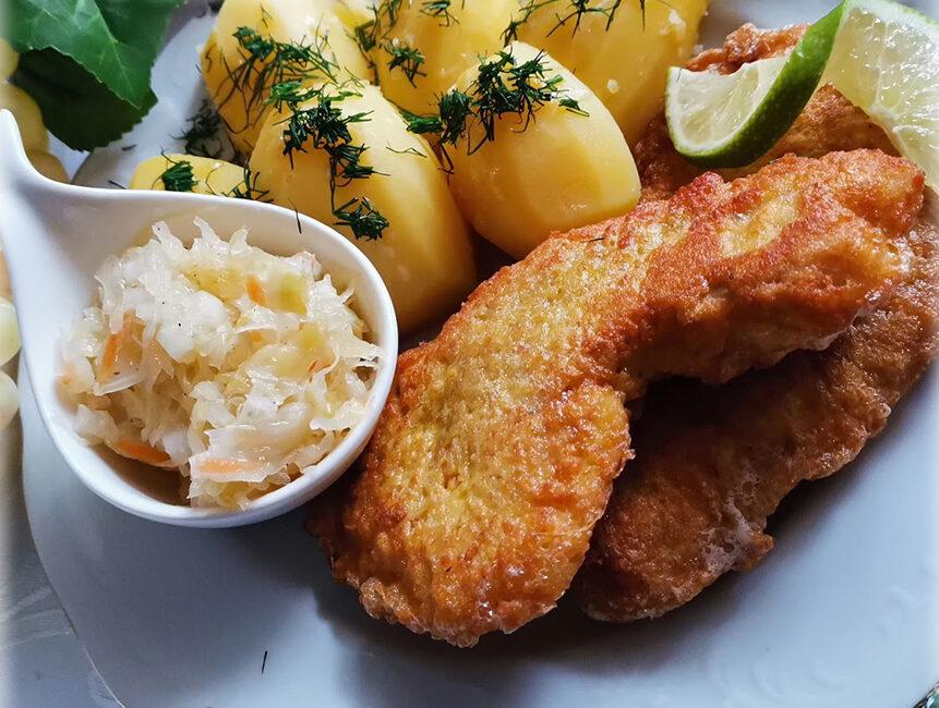 Filet z morszczuka, ziemniaki, surówka z kiszonej kapusty
