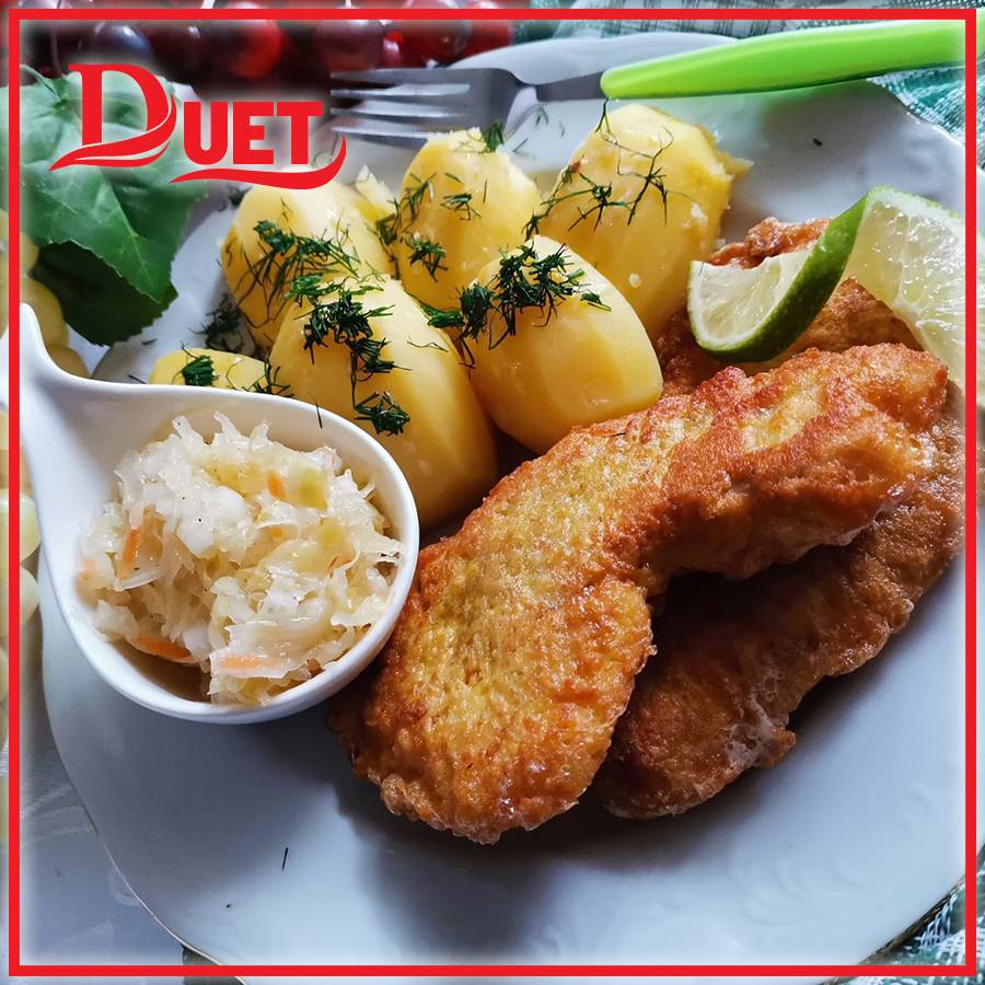 Tilapia zapiekana, ziemniaki, surówka z kiszonej kapusty