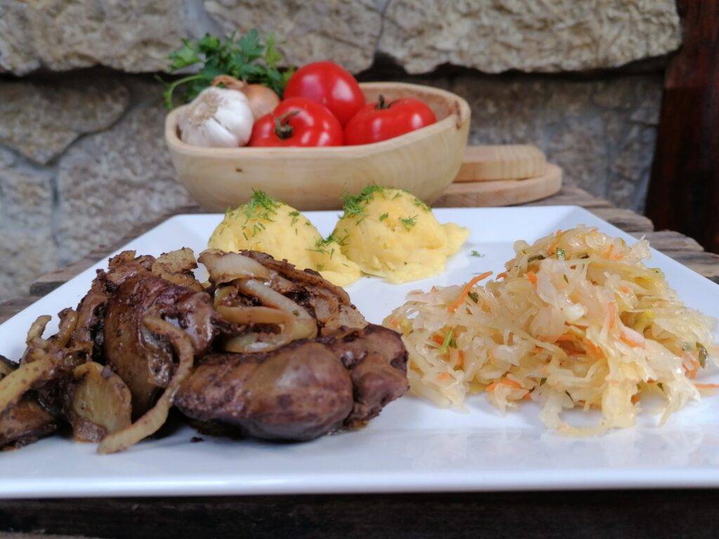 Wątróbka drobiowa, ziemniaki, surówka z kiszonej kapusty