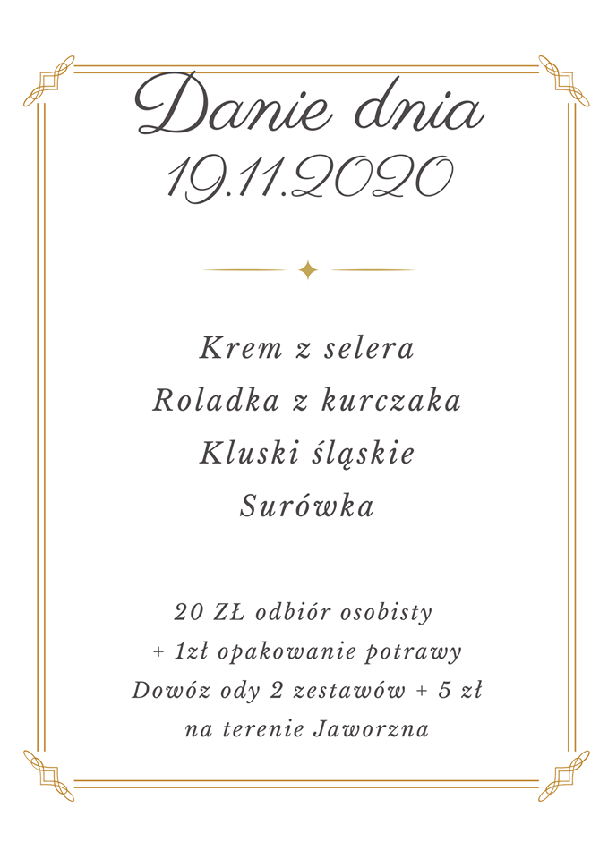 Jaworzno ul. Hugona Kołłątaja 4A Telefon do zamówień 507930534 Zamówienia przyjmujemy od godziny 9.00 do 15.00 Dowozimy i wydajemy od godziny 12.00 do 17.00 Przy zamówieniu za minimum 30 zł dowóz GRATIS. Jesteśmy do Państwa dyspozycji 7 dni w tygodniu. Cena zestawu dnia (zupa+drugie danie): 20,00 zł odbiór własny w restauracji 22,00 zł na dowóz do klienta.