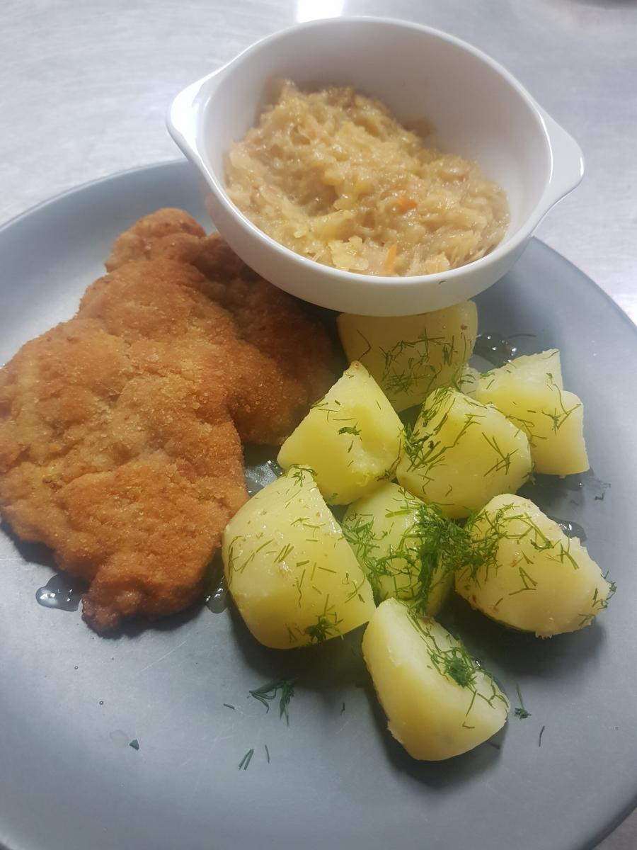 Schab panierowany, ziemniaki, kapusta zasmażana