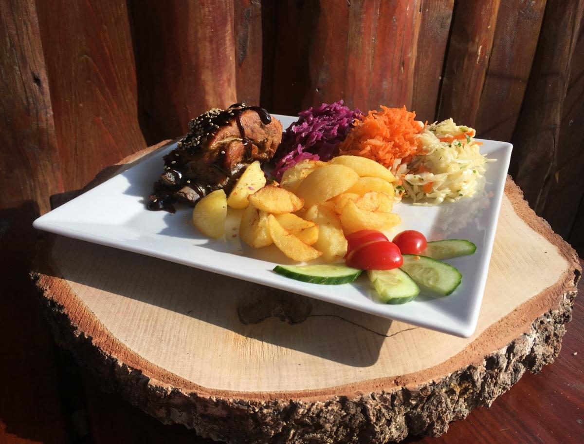 Żeberka w sosie barbecue, ziemniaki opiekane, zestaw surówek