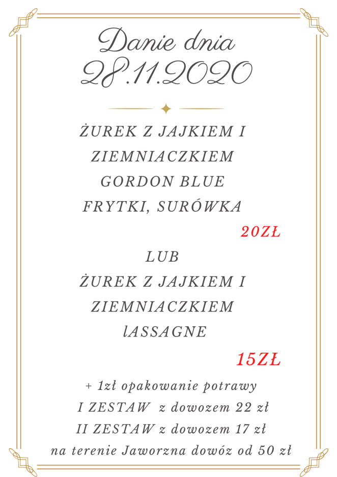 Jaworzno ul. Hugona Kołłątaja 4A Telefon do zamówień 507930534 Zamówienia przyjmujemy od godziny 9.00 do 15.00 Dowozimy i wydajemy od godziny 12.00 do 17.00 Przy zamówieniu za minimum 30 zł dowóz GRATIS. Jesteśmy do Państwa dyspozycji 7 dni w tygodniu. Cena zestawu dnia (zupa+drugie danie): 20,00 zł odbiór własny w restauracji 22,00 zł na dowóz do klienta.
