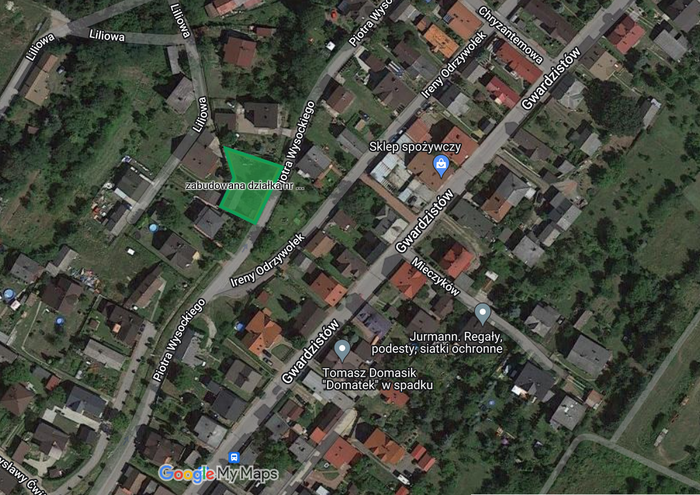 Oferta dotyczy działki nr 1912/85 o powierzchni 475 m², położonej przy ul. Wysockiego 17 w Jaworznie.