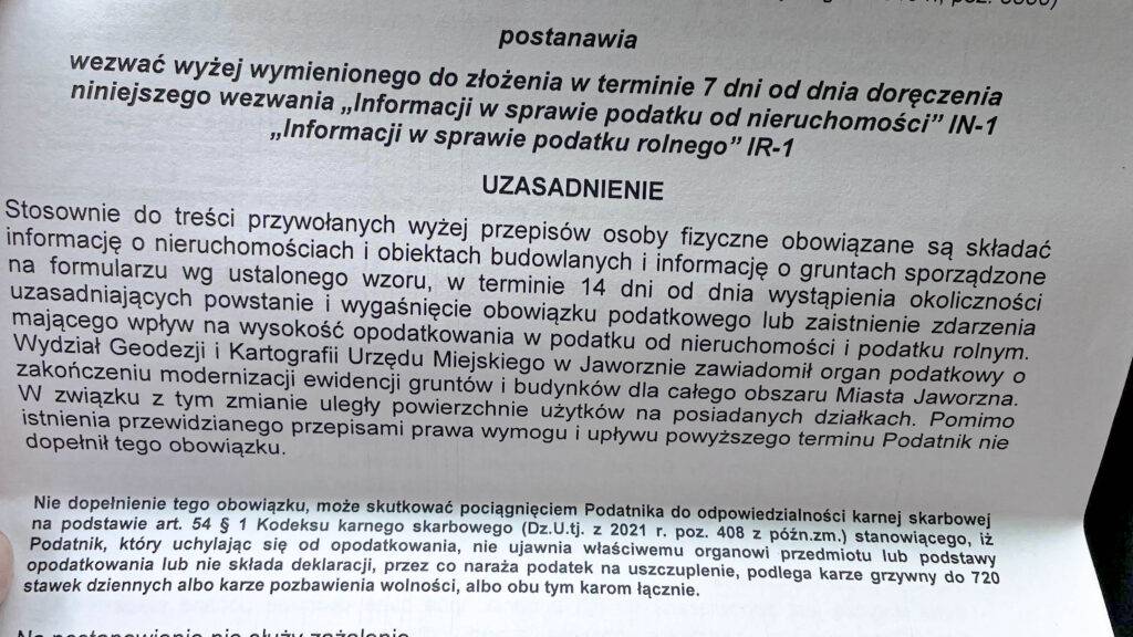 Do naszej redakcji dociera coraz więcej informacji od mieszkańców naszego miasta, że wielu jaworznian dostaję z Urzędu Miasta pisma odnośnie do podatku od nieruchomości oraz podatku rolnego. W tych pismach jest napisane, że Wydział Geodezji i Kartografii Urzędu Miejskiego w Jaworznie zakończył modernizacje ewidencji gruntów i budynków na terenie całego Jaworzna i dokonał weryfikacji, z której wynikło, że wiele osób dostaje inną deklarację podatkową niż wcześniej.