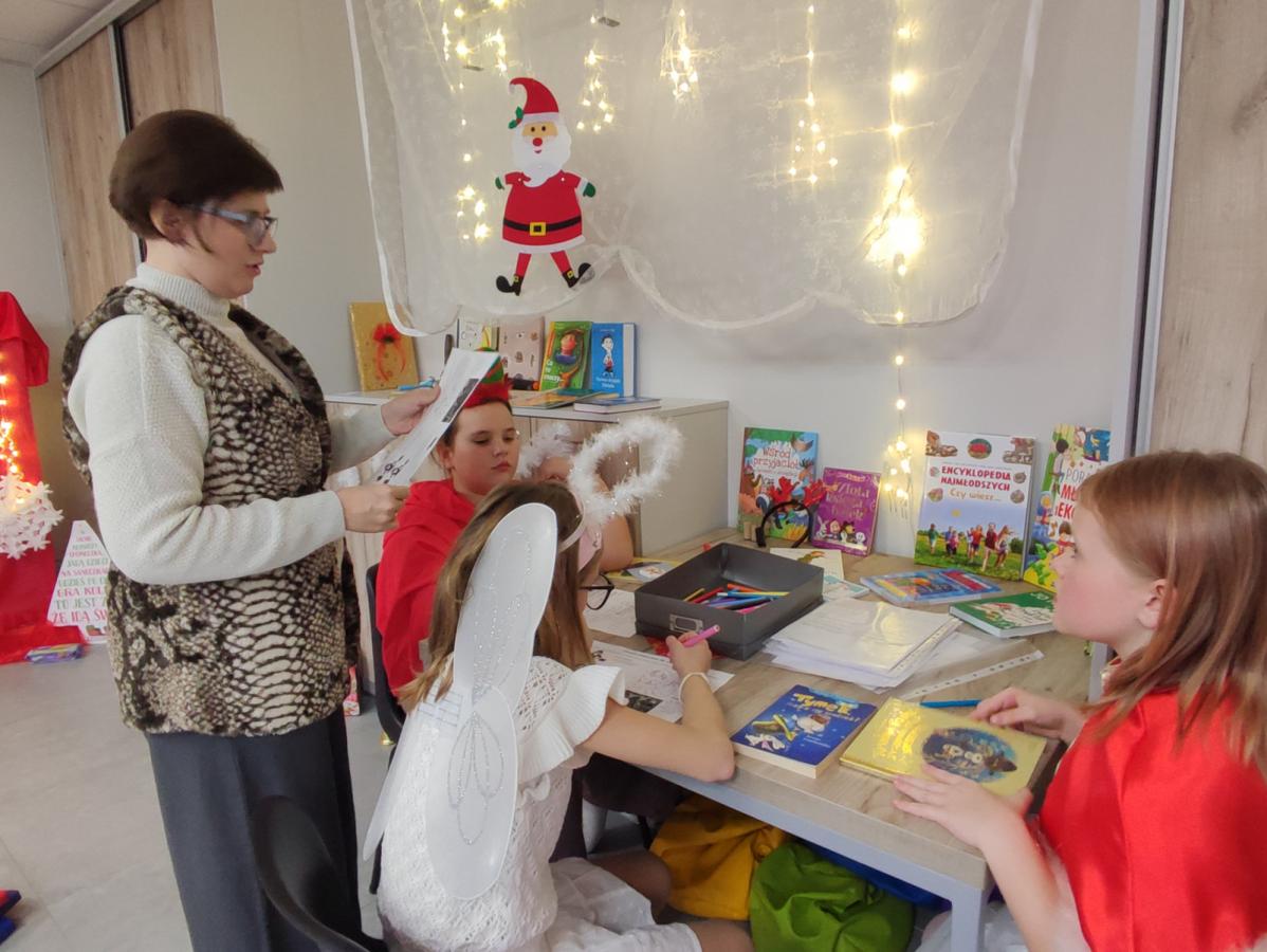 Śmiałków, którzy podjęli intelektualne wyzwanie- obdarowywała imponującymi książkowymi podarkami. Zabawy integracyjne poprowadziła śnieżynka Wanda. Kuchmistrzyni Ewa serwowała korzenne ciasteczka i gorące kakao. I wreszcie zjawił się Max Mikołaj wraz z Aniołem Wiktorią, śnieżynkami Anitą i Natalią oraz elfem Emilią.