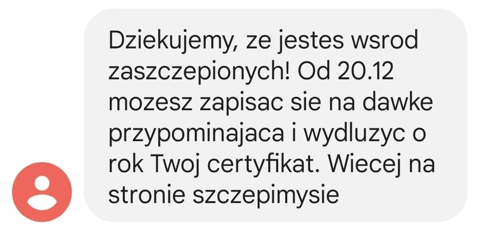 "Dziękujemy, że jesteś wśród zaszczepionych! Od (data, od której adresat wiadomości może się zapisać na dawkę przypominającą) możesz zapisać się na dawkę przypominającą i wydłużyć o rok Twój certyfikat" -  wiadomość o takiej treści została wysłana do milionów  już zaszczepionych przeciwko COVID-19 osób. Ministerstwo Zdrowia planuje rozesłać łącznie 15,5 mln takich SMS-ów.
