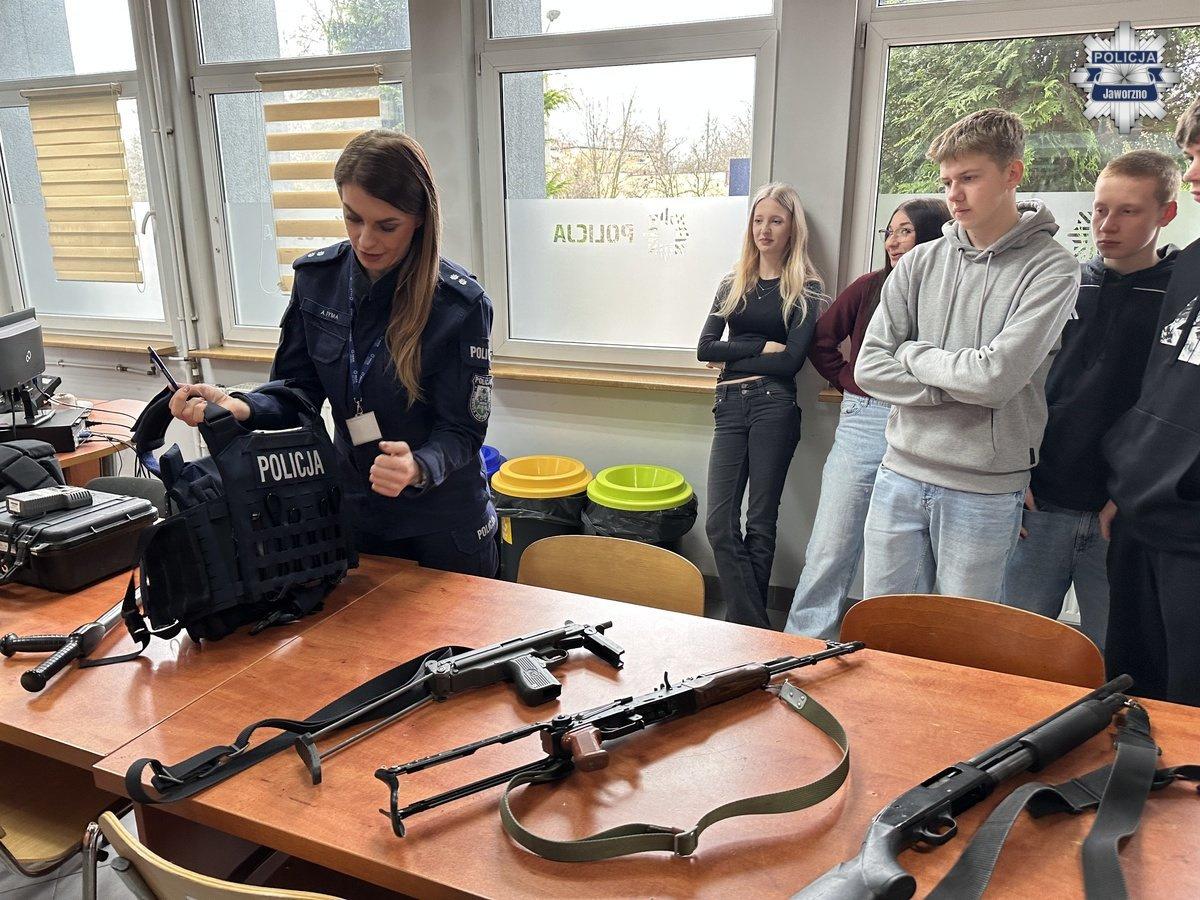 Podczas wizyty uczniowie zobaczyli również sprzęt i broń używane przez funkcjonariuszy Wydziału Prewencji. Policjanci odpowiadali na pytania, prostowali obiegowe wyobrażenia o swojej pracy i pokazywali, jak naprawdę wygląda ich służba.